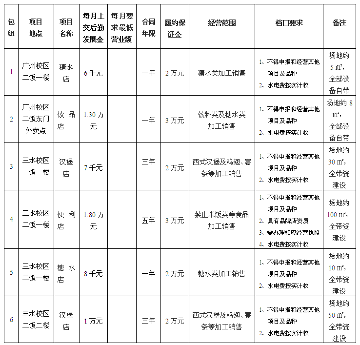 5、包3、包4、包5、包6、包11、包12、包13,由饭堂提供场地,由中标方进行设计和改造装修(设计图纸和预算清单报招标人审批后方可施工)。