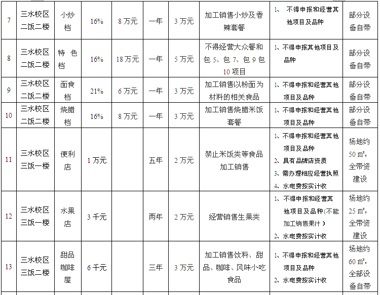 1、所有报名的投标人,必须现场考察所报店铺、档口情况,熟悉档口的基础设施情况,并根据基础设施进行项目申报,有必要的应该咨询饮食中心人员,以便准确申报。