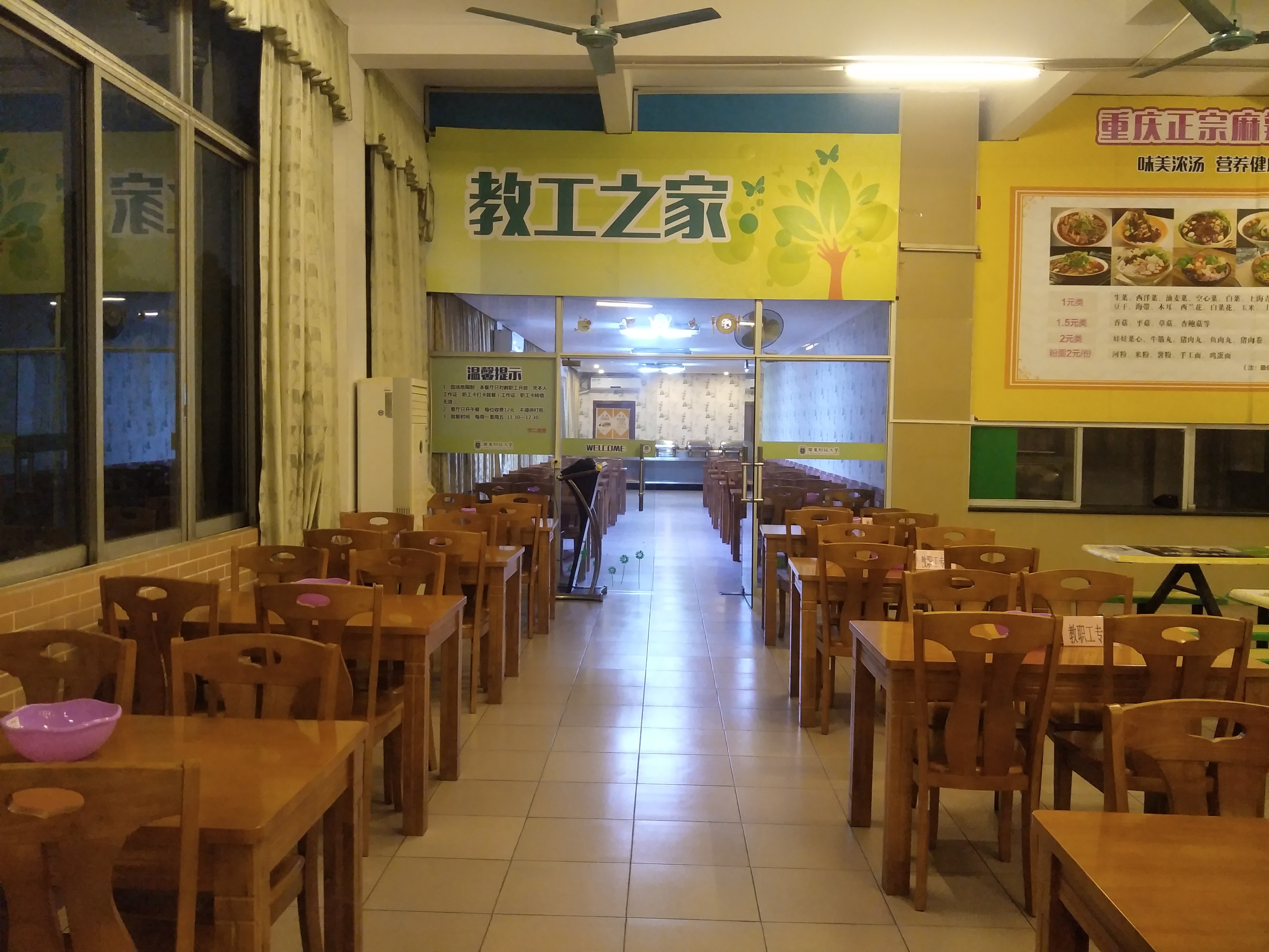 “全心全意为师生服务,保安全,保卫生,保稳定”是我处饮食服务的宗旨,并从卫生、安全、质量、营养四个方面做好食堂工作,确保师生健康及餐饮安全。如今,食堂不仅仅是提供就餐的地方,也是学生交流的公共场所,为此,我处在食堂文化上精心策划、群策群力,只为给师生们带去家的温馨。教职工与学生用餐区域整齐划分,一排排整齐的餐桌椅,一个个“微型垃圾桶”井然有序的摆放在餐桌上,一句句文明标语,熏陶着学生心里。