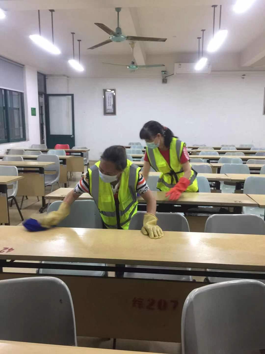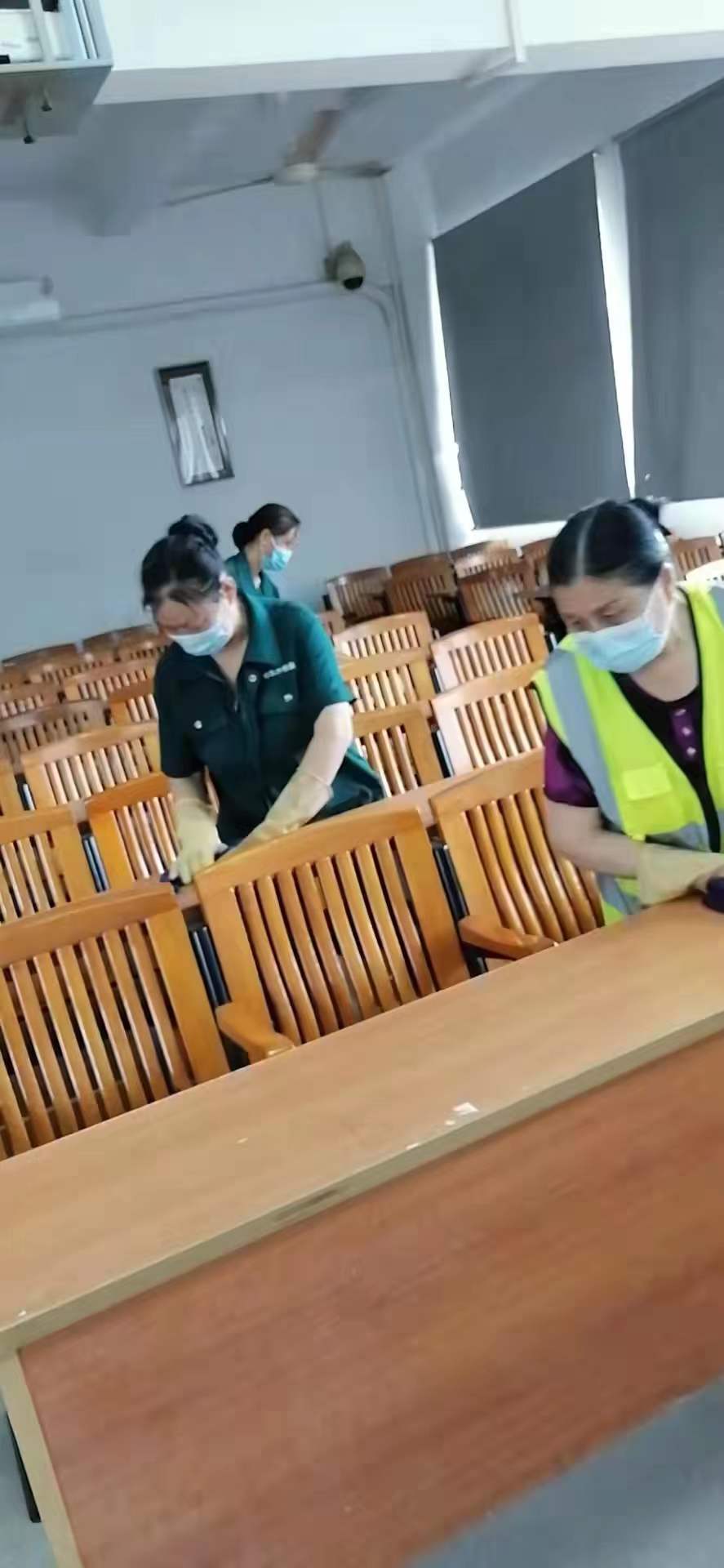 物业工作人员每日定时对楼宇的走廊过道、卫生间、电梯间、日常生活设施等公共区域进行清洁消毒,同时对垃圾收集设施等关键部位定期进行清扫消毒,为在校师生营造安全卫生的生活环境。