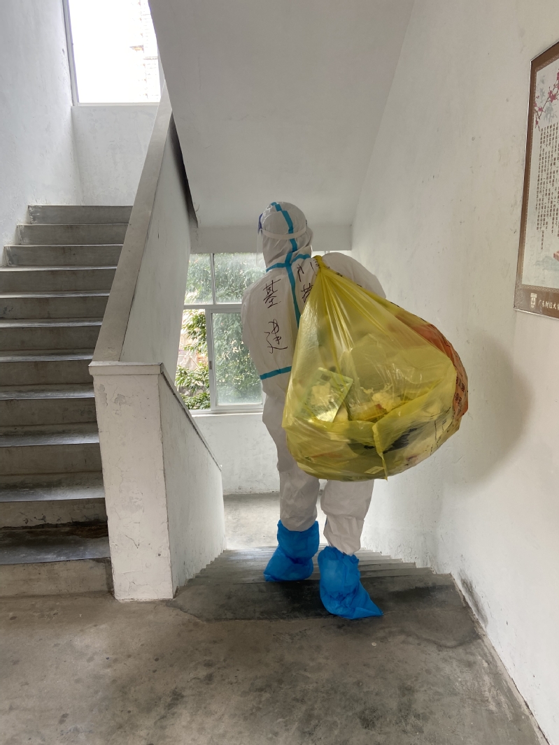 不畏艰险,勇挑重任。在学校物资、人手紧缺的困难情况下,基建抗疫突击队迎难而上,主动提出承包最辛苦的“差事”----没有电梯的高风险封控宿舍,先后承担了第27栋、第21栋学生宿舍的抗疫服务工作。八层楼梯楼,志愿者上门服务难度大,物业人手短缺,存在垃圾处理不及时的问题。为了更加高效便捷的为学生提供服务,处领导靠前指挥,突击队员们不畏艰险,身兼数职,默契配合,包揽了从运送餐食、发放餐食、协助核酸检测到清运生活垃圾“一条龙”抗疫任务,有条不紊地开展各项工作,既节约了人力资源,也提高了管理效率,切实保障了学生的生活所需。