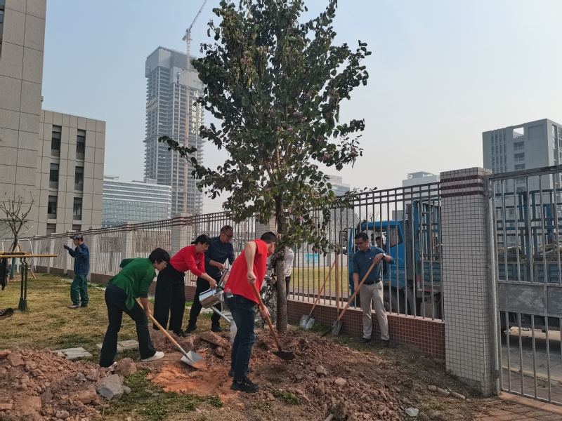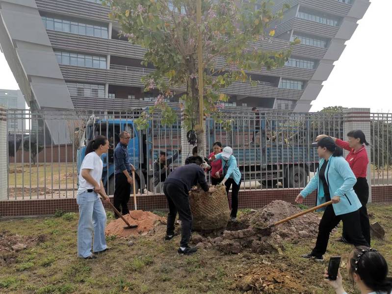 “把坑再挖深点,把土压实,有利于成活。”“多浇点水,让树苗尽情吸收水分,早日开花。”植树现场,在支部书记胡卫标、郑红艳的带领下,大家一同挖坑、扶苗、覆土、浇水,相互配合,干劲十足,劳动现场繁忙有序、气氛活泼热烈。经过两个多小时的团结协作,北田径场东侧22棵宫粉紫荆树迎风挺立,将北田径场装点得生机盎然。
