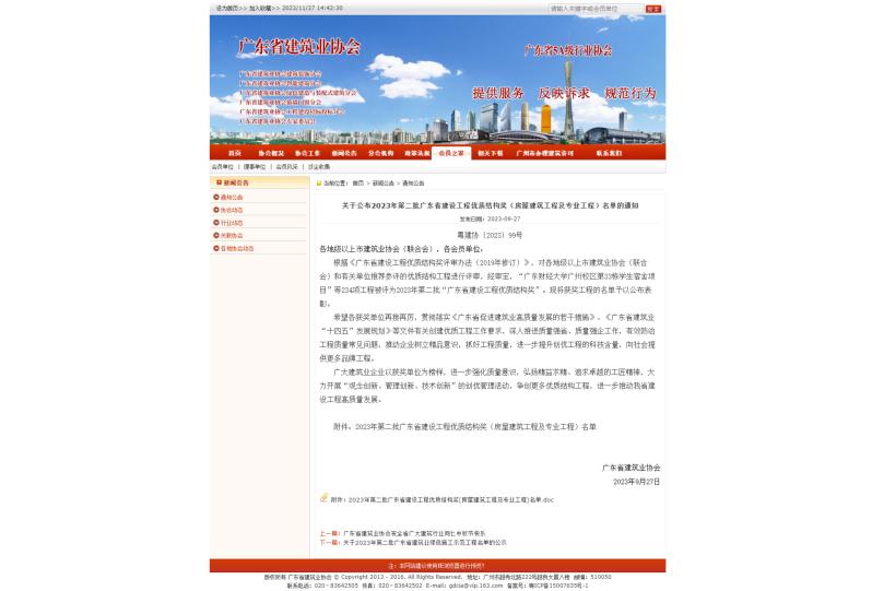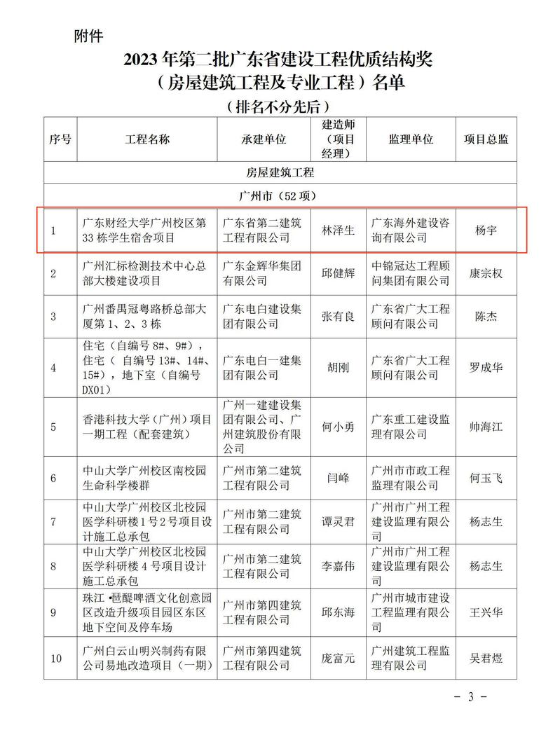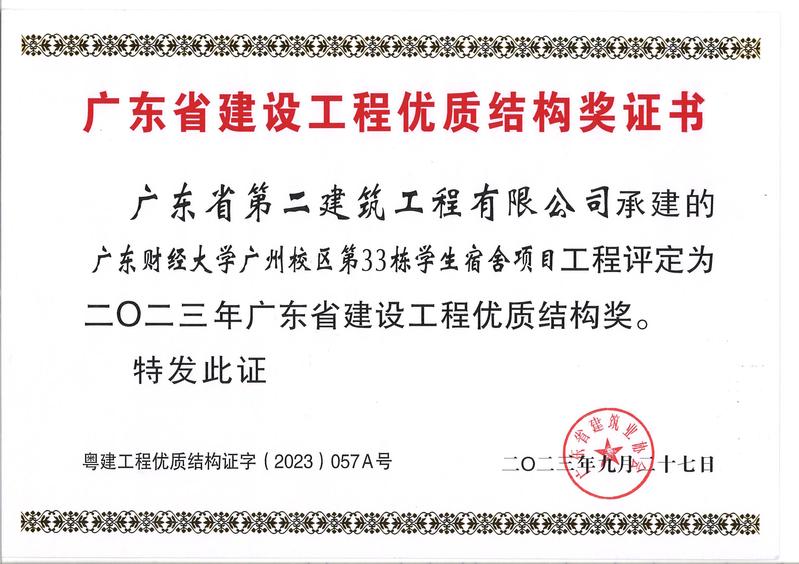 近日,广东省建筑业协会公布了2023年第二批广东省建设工程优质结构奖(房屋建筑工程及专业工程)名单。我校明胜m88官网第33栋学生宿舍项目工程荣登榜单,获评“二〇二三年广东省建设工程优质结构奖”,这也是广东省建设工程优质结构最高荣誉奖。在此之前,该工程还获得了2022年“广东省建设工程项目施工安全生产标准化工地”、“广东省房屋市政工程安全生产文明施工示范工地”等荣誉。