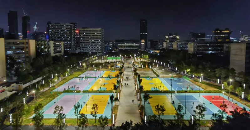 大湾体育公园由大湾教育科技集团捐赠,投入超2000万。公园总面积28670平方米,场地内设置了7个篮球场(其中1个为下沉中心篮球场)、3个匹克球场、5个羽毛球场/排球场、1个网球场及2个网球练习场、1个滑板区及一条围绕球场而设的550m慢跑道,场地各处皆设置了林下休闲健身区域,环境优美,满足学生和老师日常教学、训练以及课余的健身、体闲需求。