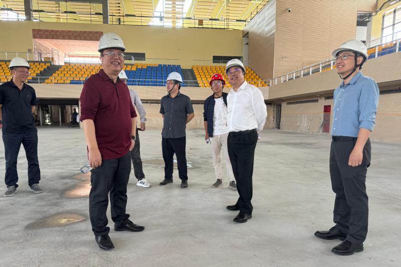 在施工现场,郑贤操详细询问了工程进度、施工质量和安全管理等方面的情况,对工程进展及施工一线人员的辛勤付出给予了肯定。同时,他对各参建单位提出了指导性意见。郑贤操强调,本项目已进入施工最后冲刺阶段,在保证安全和质量的前提下,要加快工程进度,确保体育综合馆如期完工投入使用,满足学校发展的需求。各参建单位表示,将认真落实要求,加快推进施工进度,高质量、高标准完成建设任务。